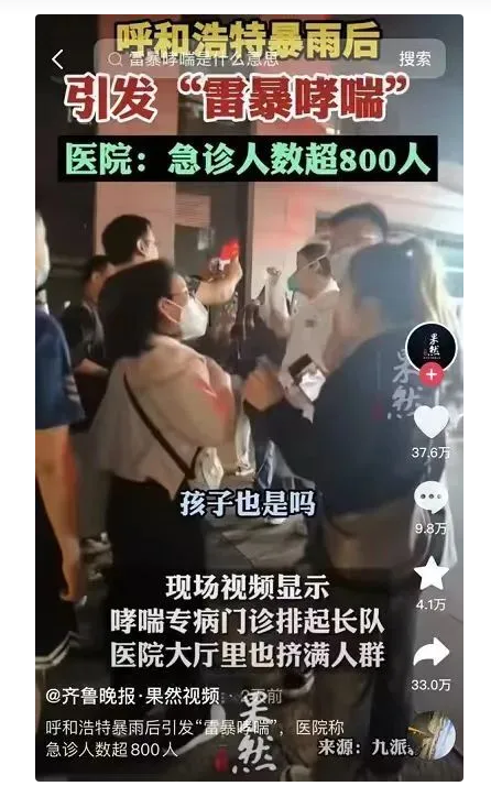 有醫生喊話:“哮喘的患者,來我這拍下藥名去買藥,買到藥不會用的我來教你。”內蒙古醫科大學附屬醫院一名醫生在解釋為何會出現群體性哮喘時回應:“雷雨天氣過后花粉濃度太高了,過敏體質人群易出現‘雷暴哮喘’,這次引發的‘雷暴哮喘’,患者遍及各個年齡段。”